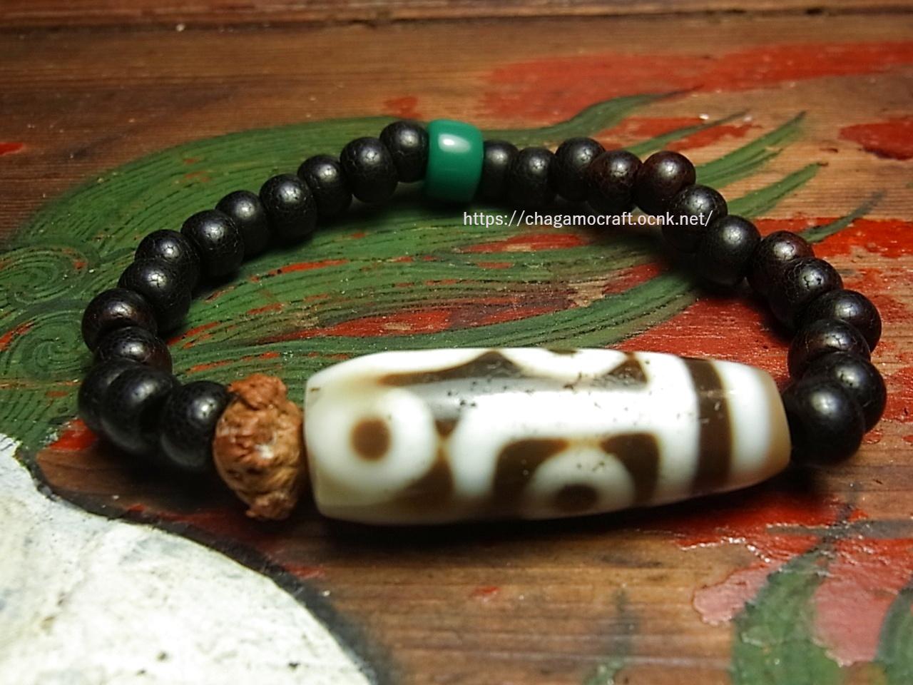 差し色にチベット念珠の天玉に用いられる樹脂玉(緑)を合わせました。