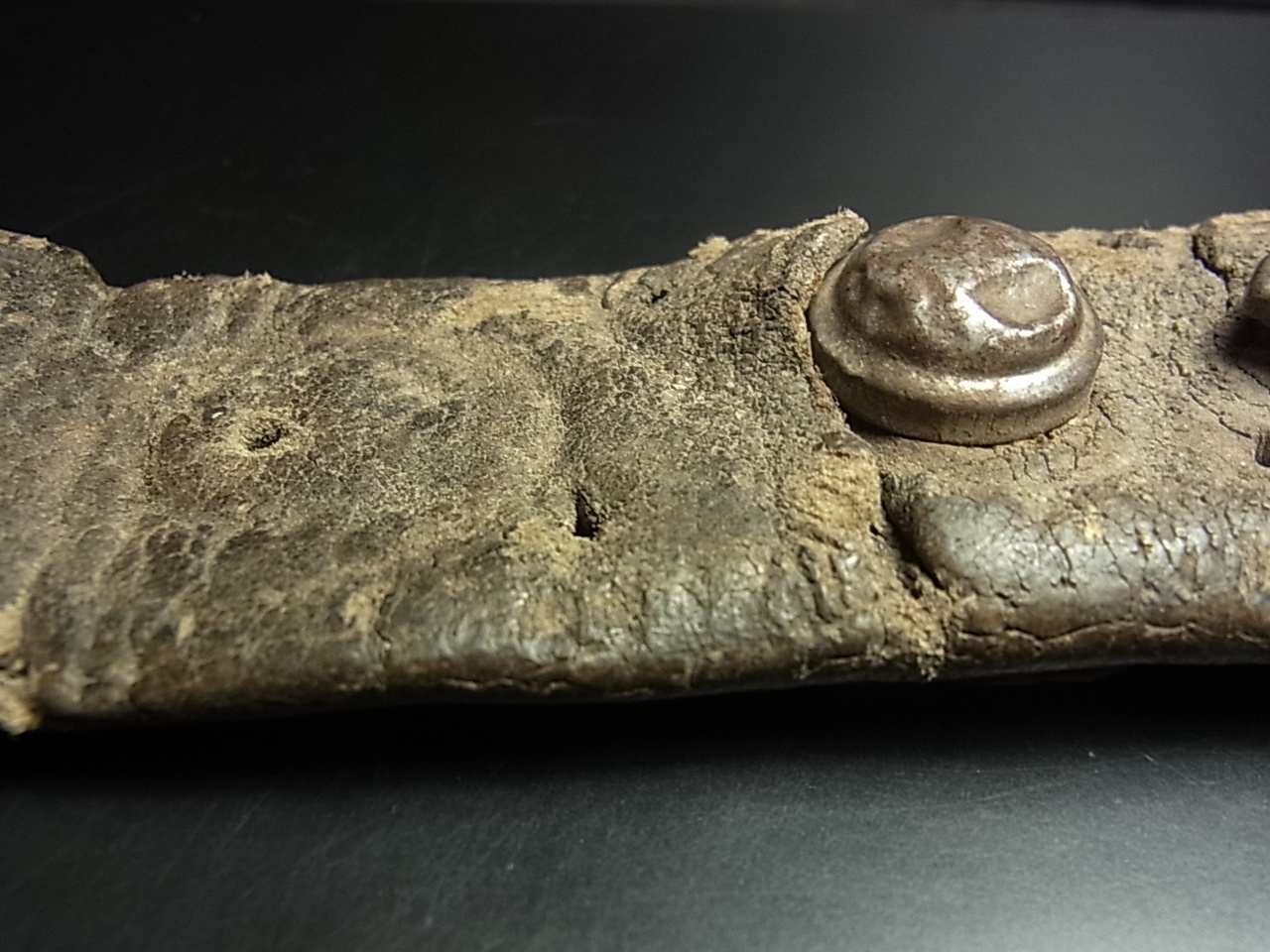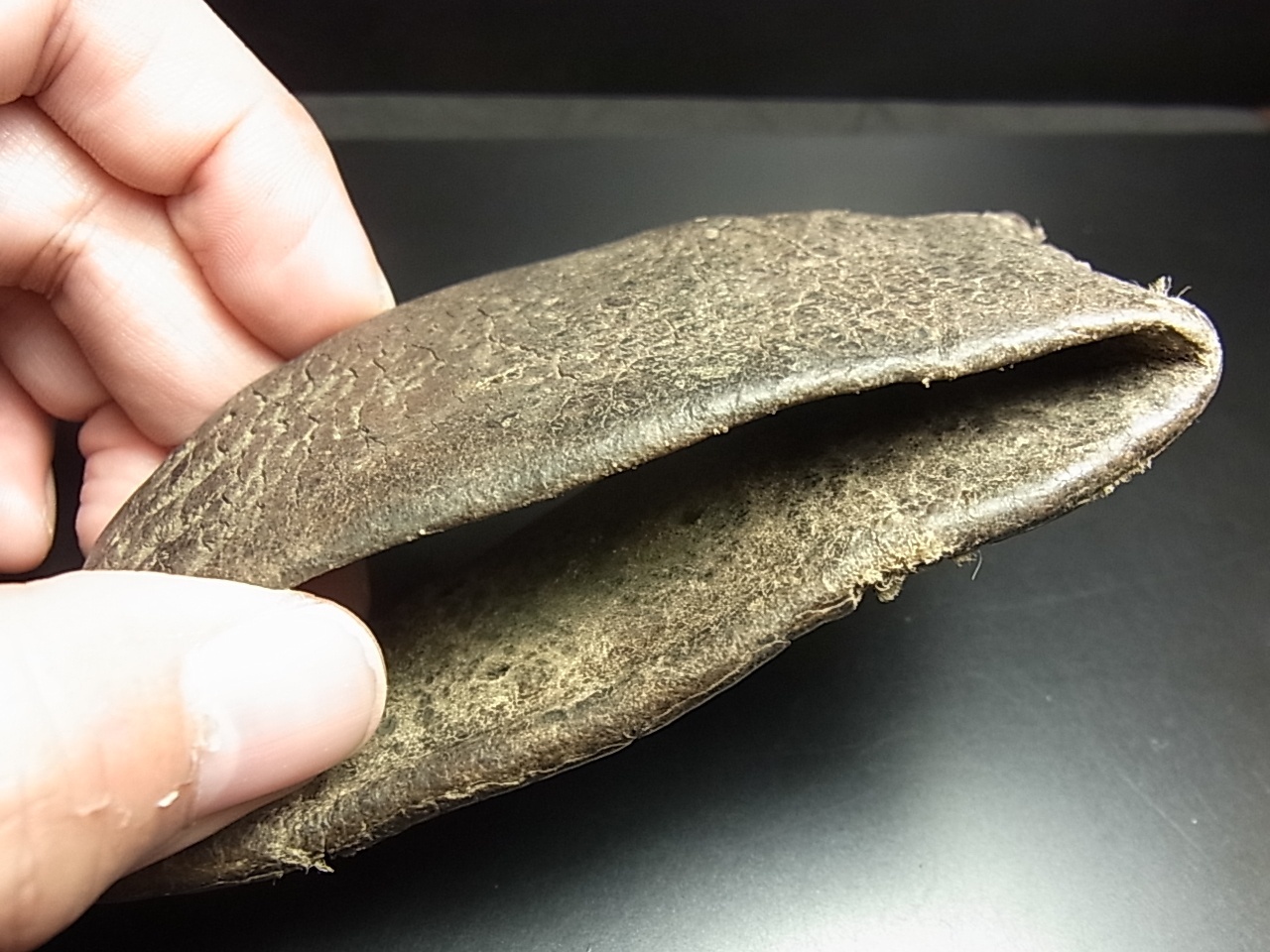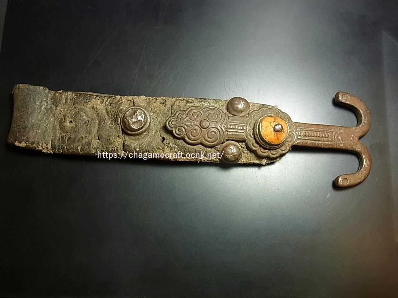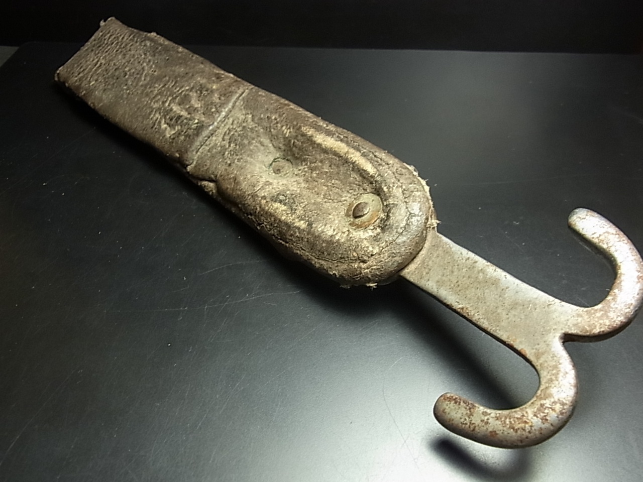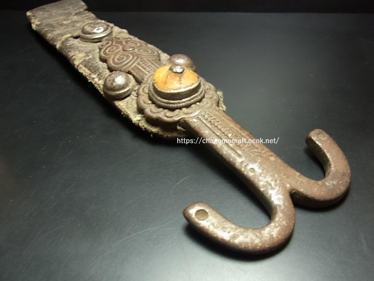 鉄製の鉤金具も革部分も非常に味があり、現在ではローカルでも入手困難な道具です。