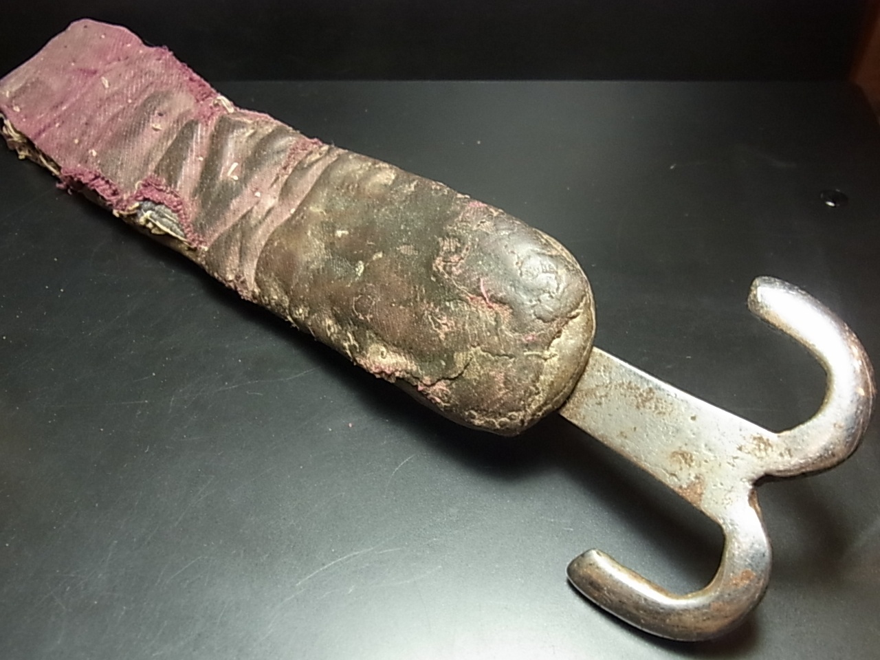 鉄製の鉤金具も革部分も非常に味があり、現在ではローカルでも入手困難な道具です。