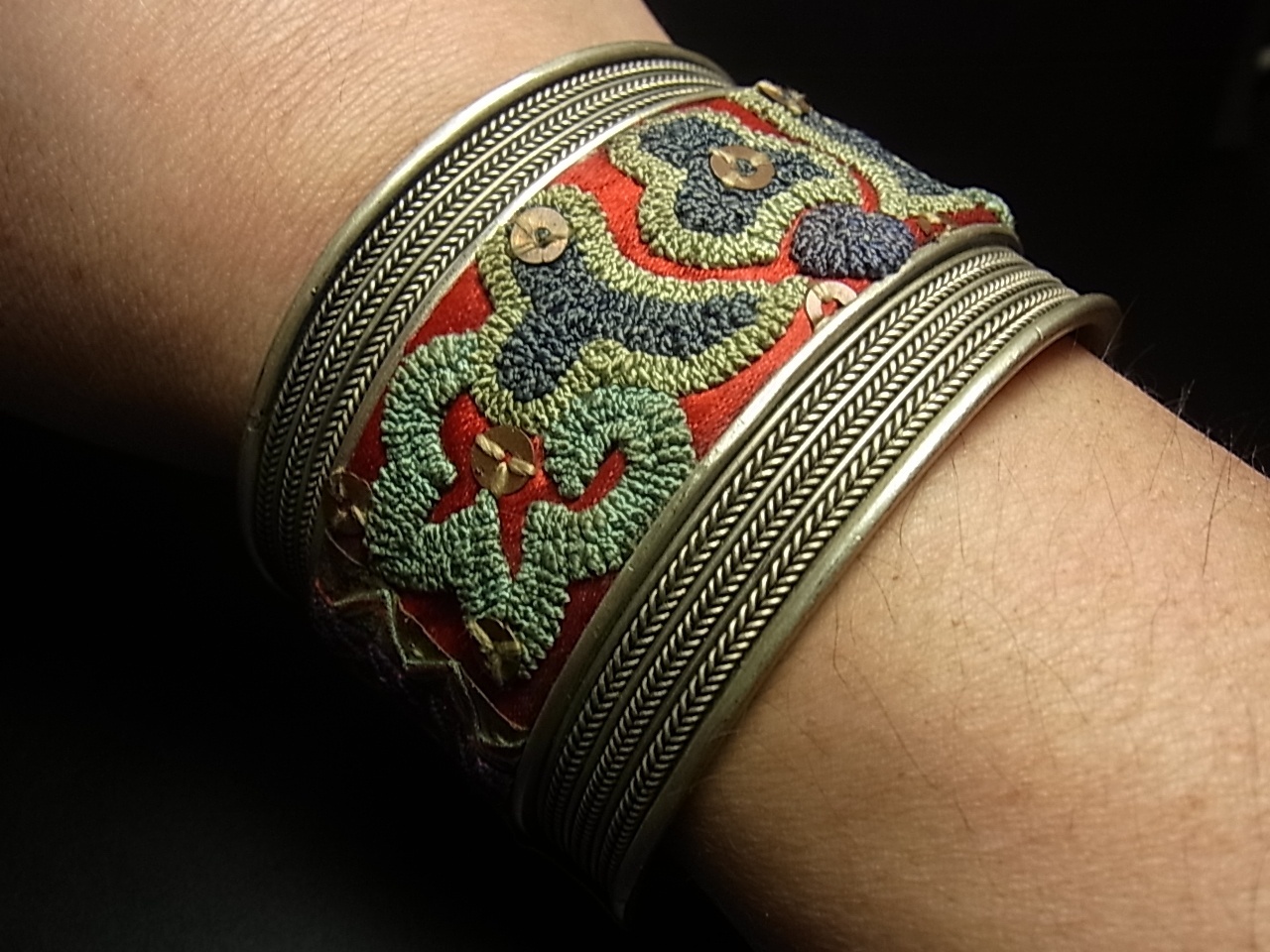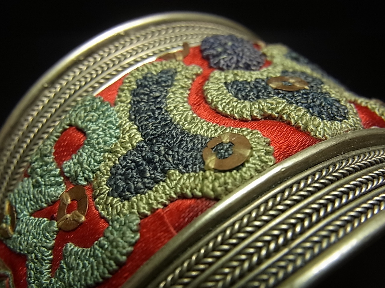 貴州省ミャオ族の刺繍古裂バングル(苗銀)プリーツドブレードステッチ Old embroidery Miao silver bangle