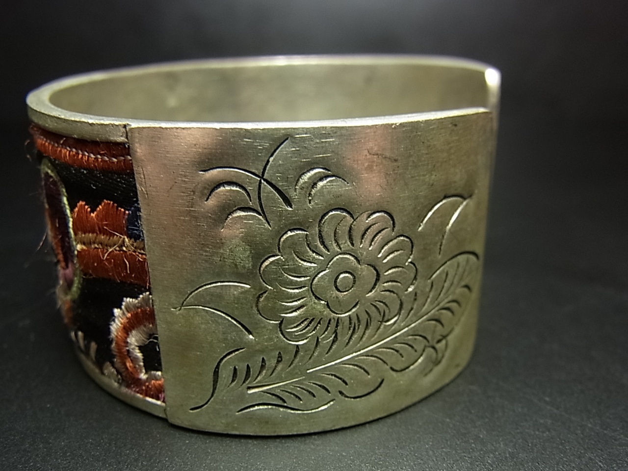 貴州省ミャオ族(苗族)の刺繍古裂を用いたシルバー(苗銀製)バングルになります。