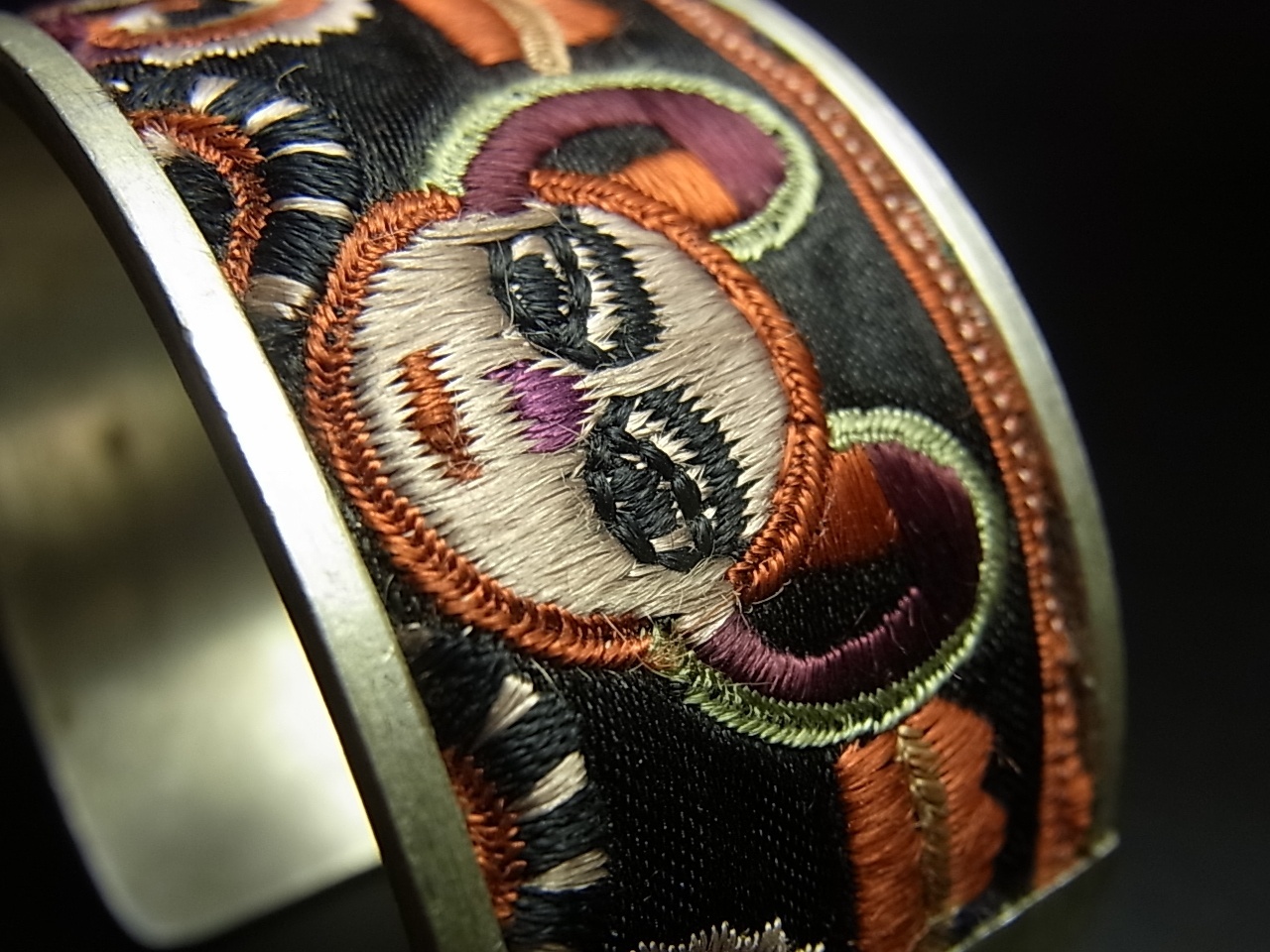 貴州省ミャオ族の刺繍古裂バングル(苗銀) 剪紙破線繍/ Split thread stitch・Old embroidery Miao silver bangle