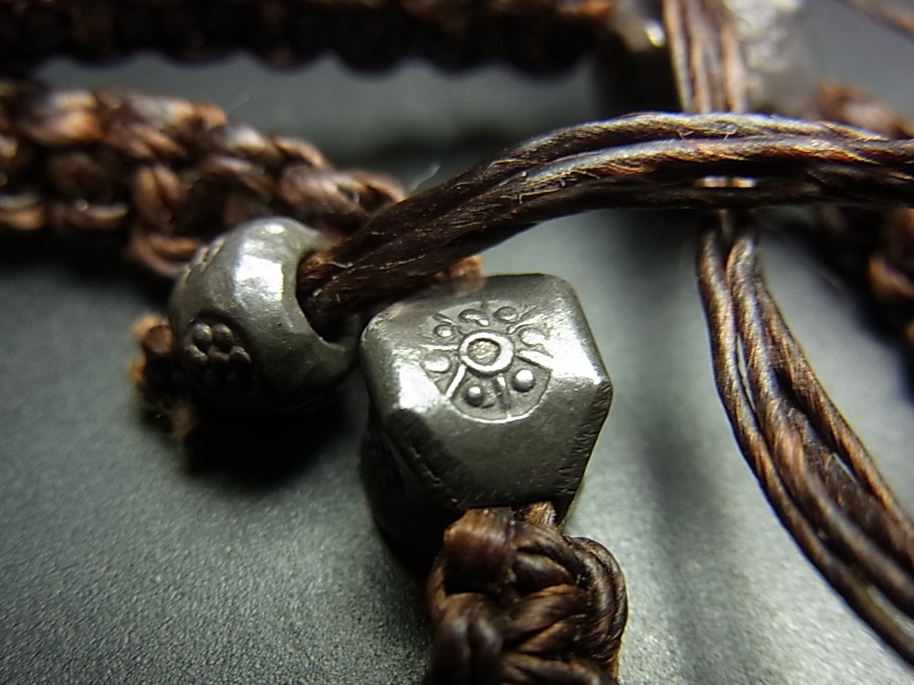 カレンシルバーの純度高めの銀ビーズと蝋引き紐で首飾りとして仕立てています。