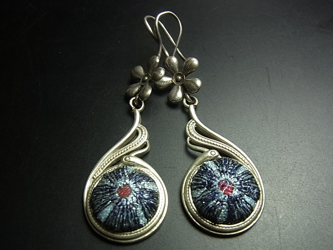 貴州省ミャオ族(苗族)の刺繍古裂を用いたミャオシルバー製のピアスになります。
