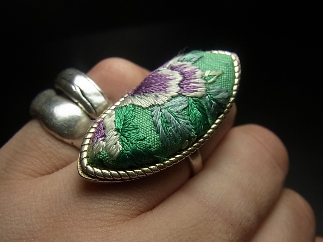 貴州省ミャオ族(苗族)の刺繍古裂を用いたミャオシルバー製のリングになります。