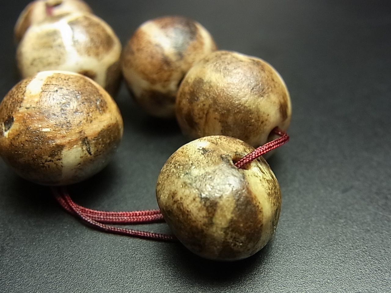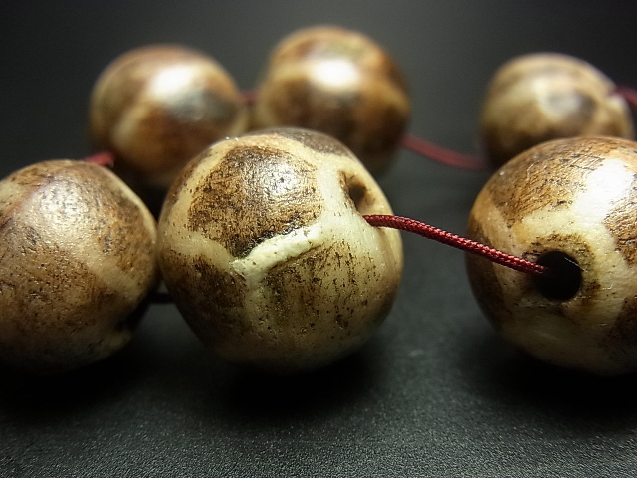 インダス文明のエッジング(カーネリアン)の腐食ビーズを起源としている点では、チベットのジービーズと共通しており、パムテックビーズにも天珠と似た図柄が存在しています。
