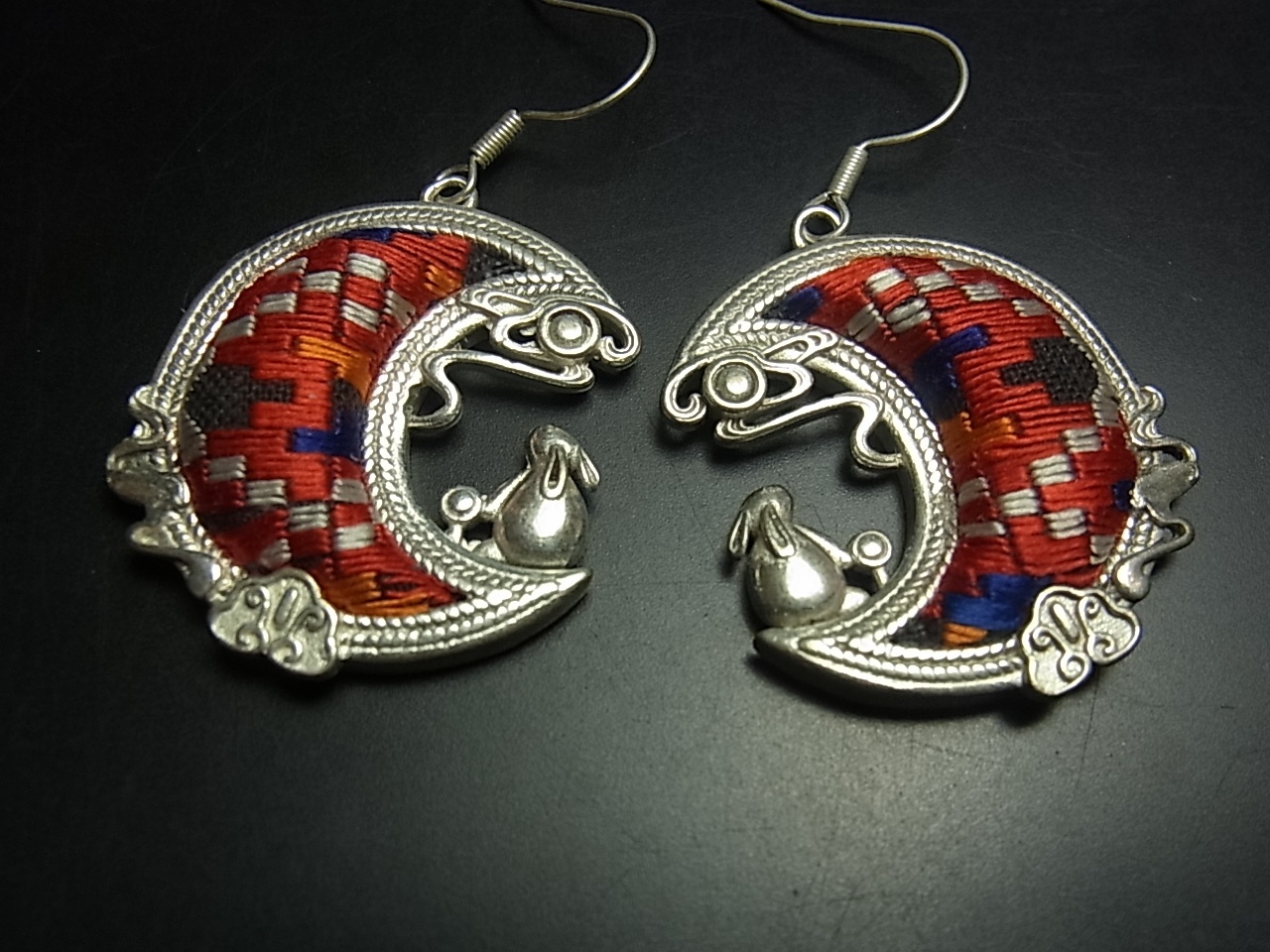 ミャオ族(苗族)の苗銀製・刺繍古裂ピアス/ Miao Old embroidery earrings