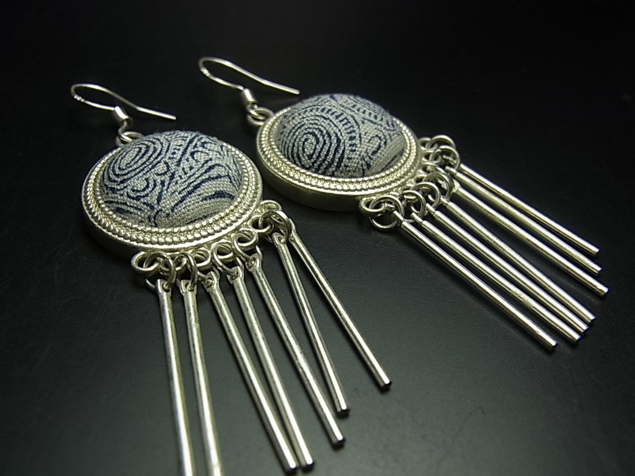 ミャオ族(苗族)の苗銀製・ろうけつ藍染め古裂ピアス/ Miao Old embroidery earrings