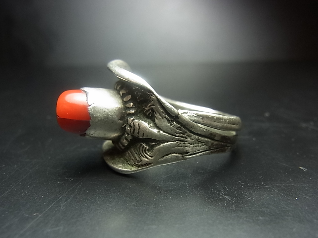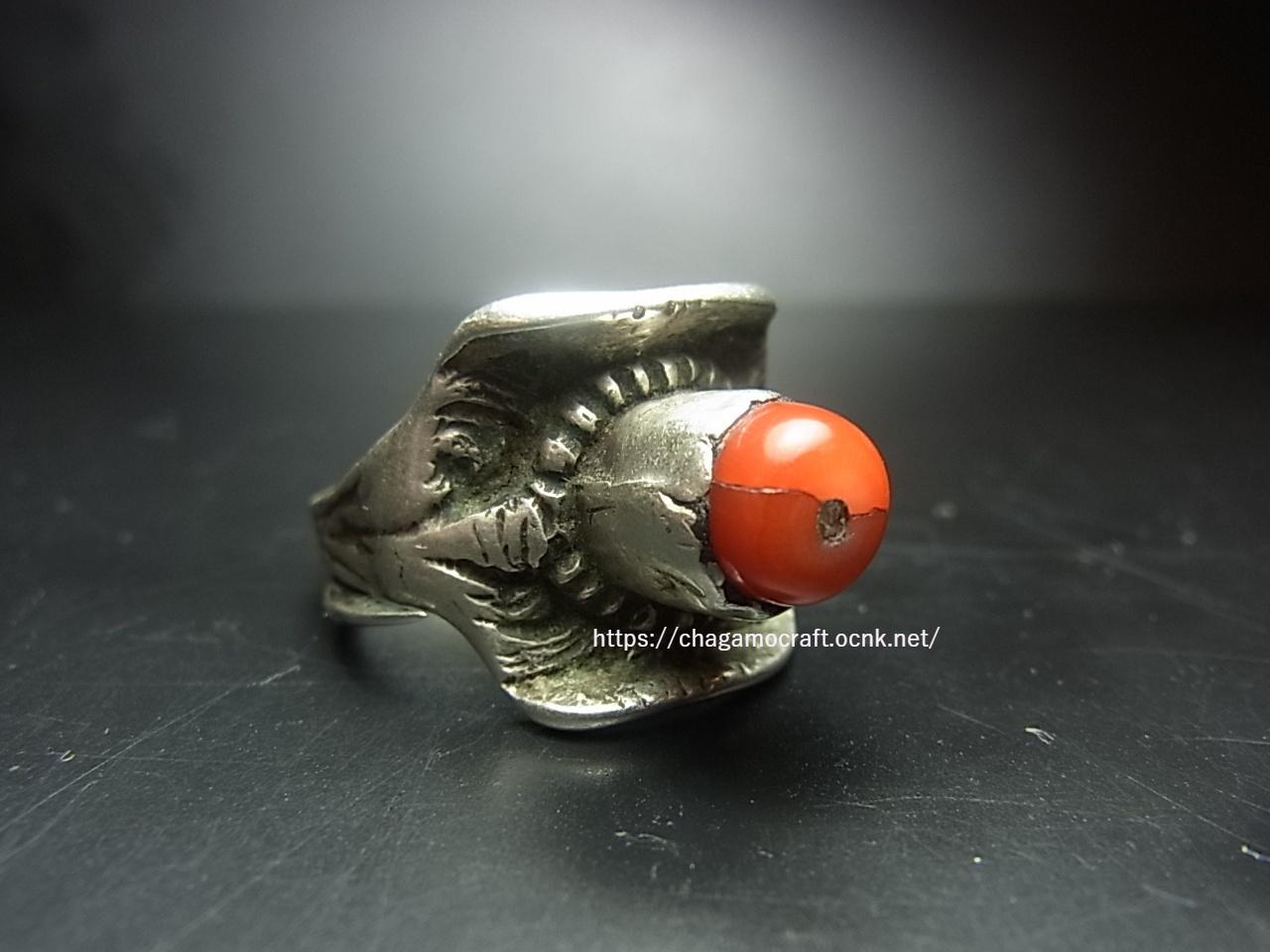 アンティークの天然珊瑚(通称・山珊瑚)がはめ込まれた純銀製の厚みのあるリングです。