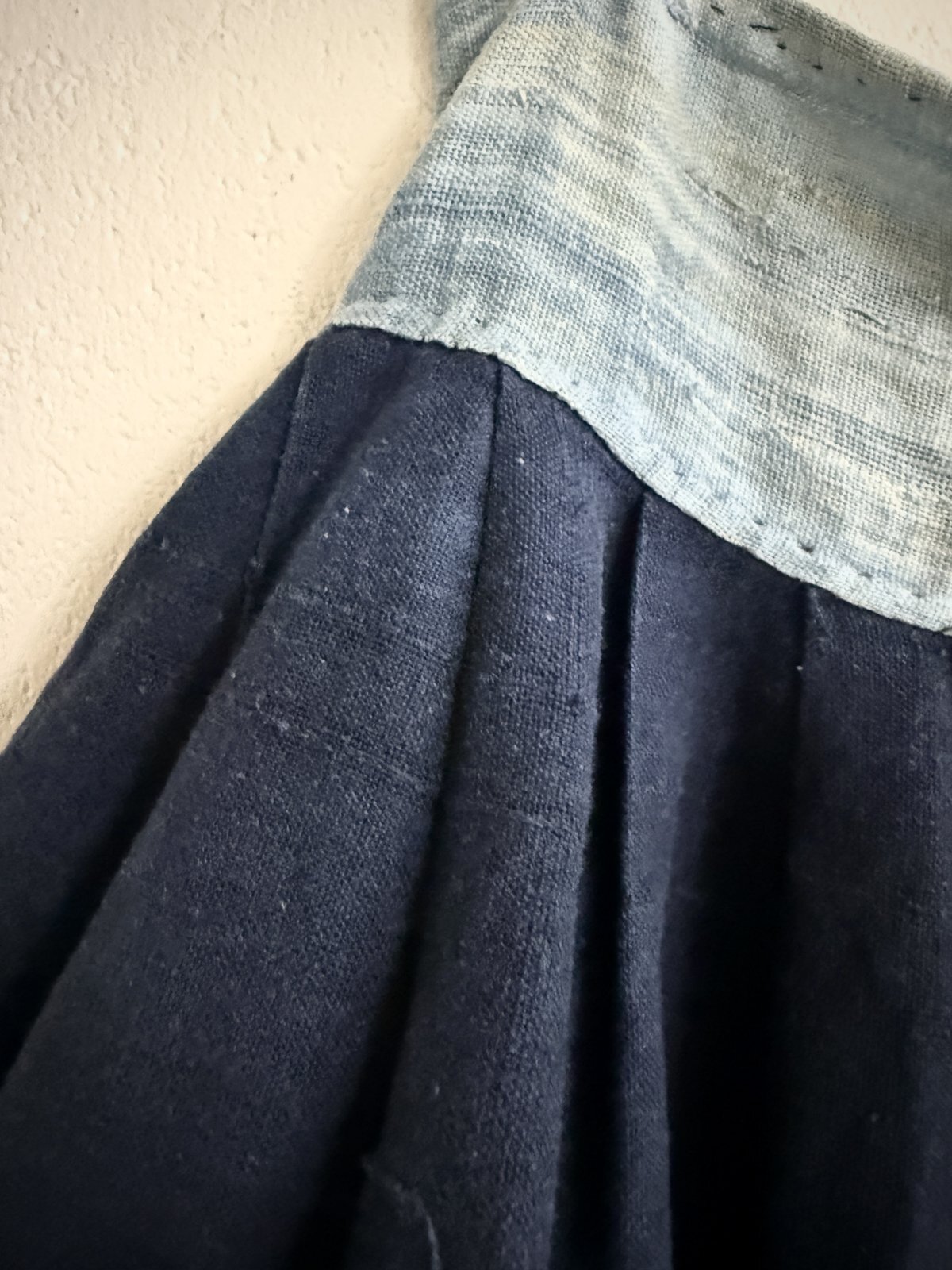 イ族のこの地域のスカートはギャザーが少し入っていますが、ベルトや腰ひもなどを用いて縛って穿くタイプになります。